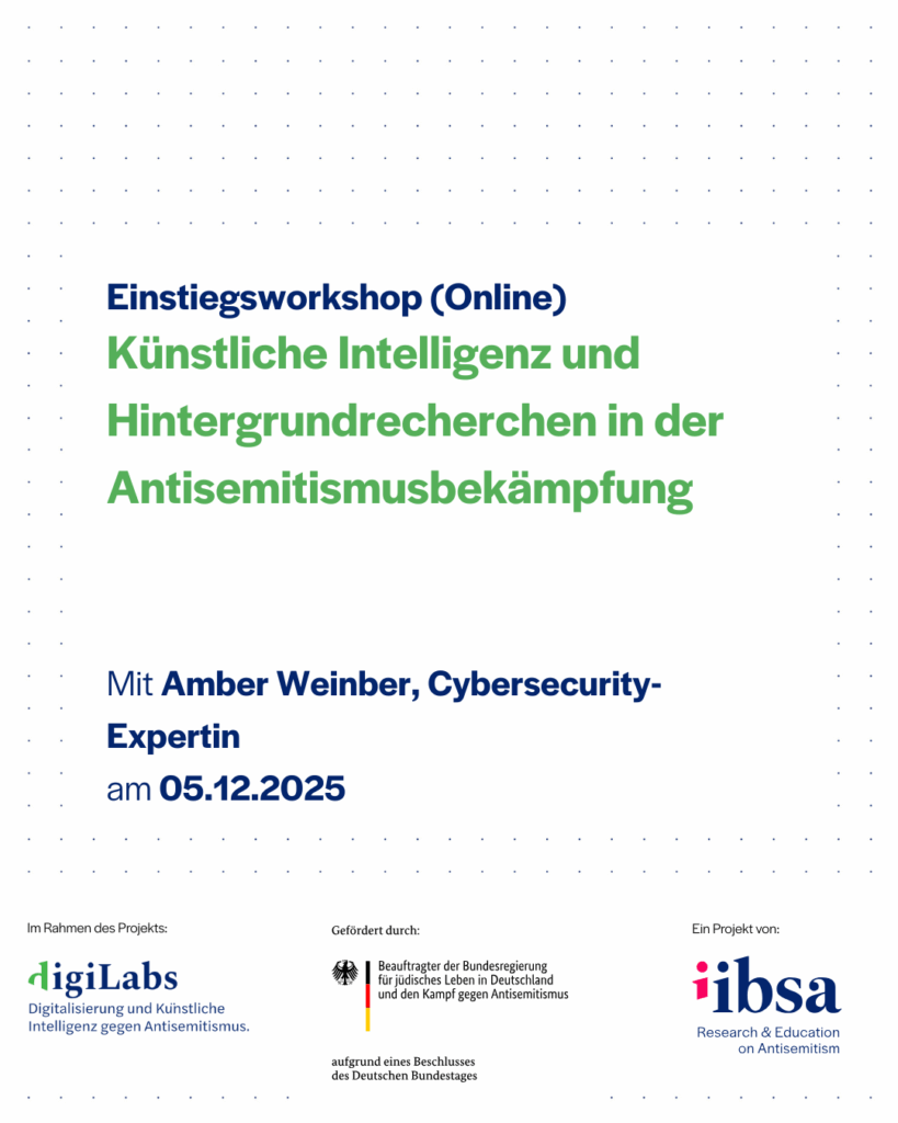 Der Workshop ist Teil des Projekts digiLabs, das vom Beauftragten der Bundesregierung für jüdisches Leben in Deutschland und den Kampf gegen Antisemitismus gefördert wird und sich mit der Nutzung von Digitalisierung und Künstlicher Intelligenz gegen Antisemitismus beschäftigt.